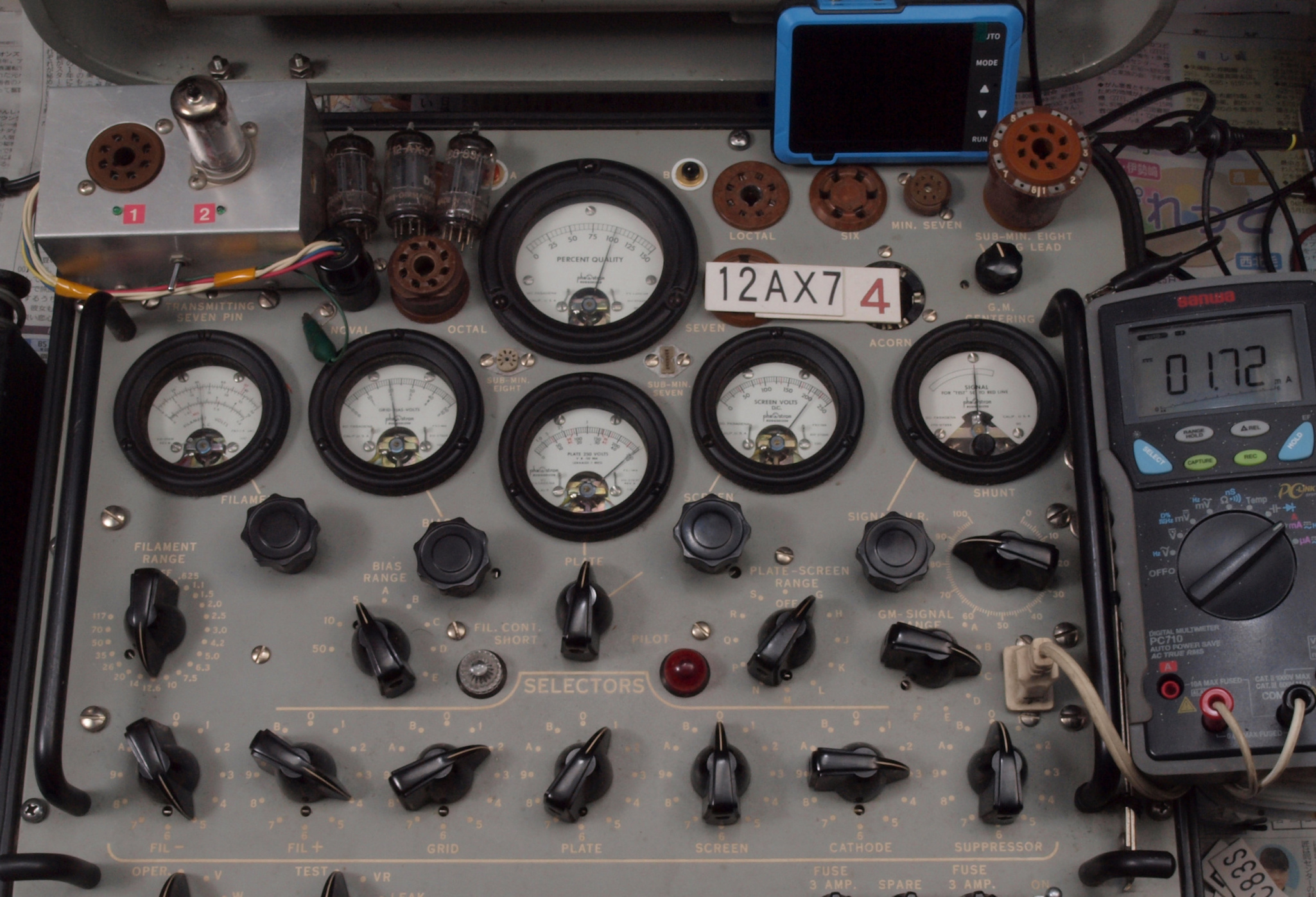 | J11. 付属1本目 12AX7 ユニット1。 Gm測定=1700μmho、IP=1.49mA。 Cレンジ=3000μmhoレンジでの測定、「Ep=250V、Eg1=−2V」 |